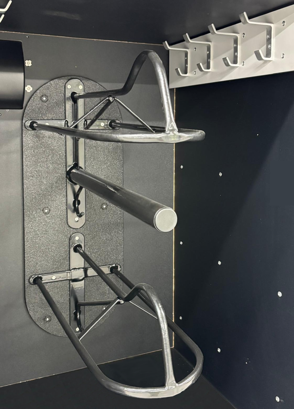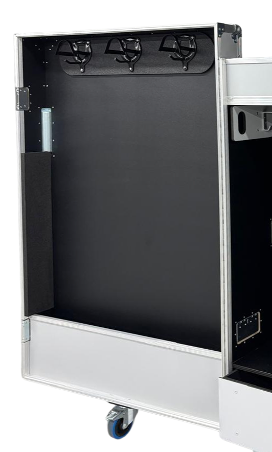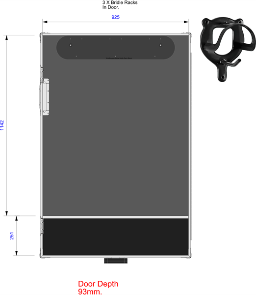 The main body of the case is a large compartment, fitted with two saddle racks, as well as two individually-sliding rails with hooks on, allowing you to hang your reins or lead ropes. The door is fitted with three bridle racks, allowing you to store everything in one compact space.