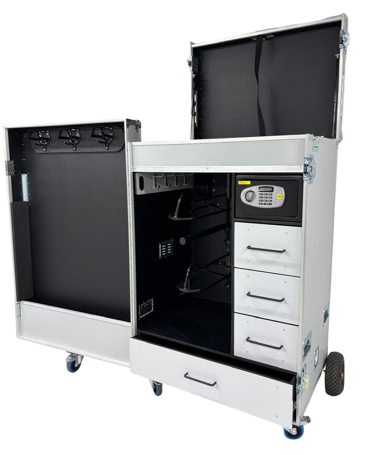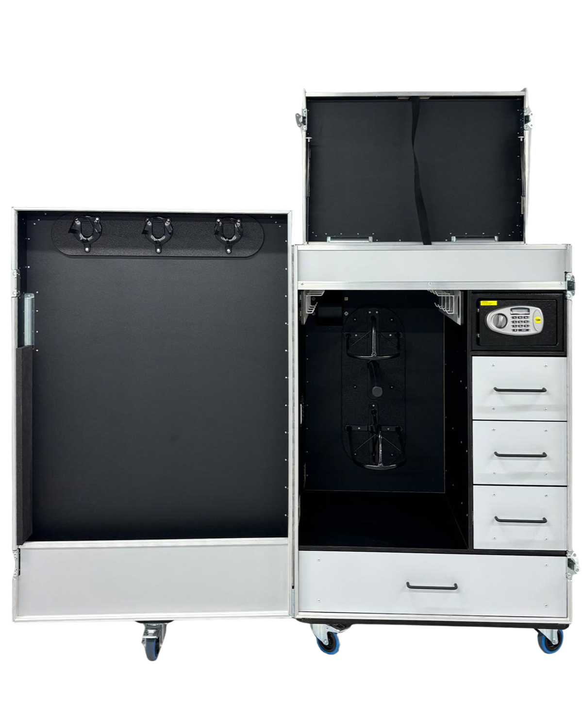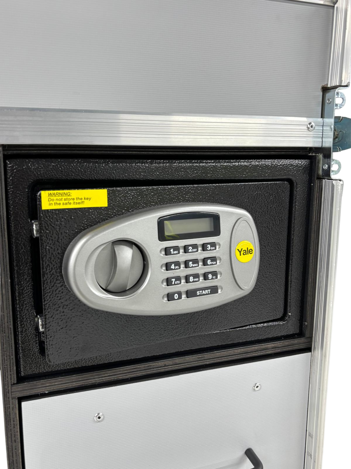 Our equestrian trunk features everything you could need for your horse tack and valuables. The case itself has a large compartment at the top, accessible via a hinged lid, as well as four sliding drawers, including one large drawer at the bottom of the case and three smaller drawers down the side. Above the drawers sits a digital keypad safe, which is fitted into the case for security and peace of mind.