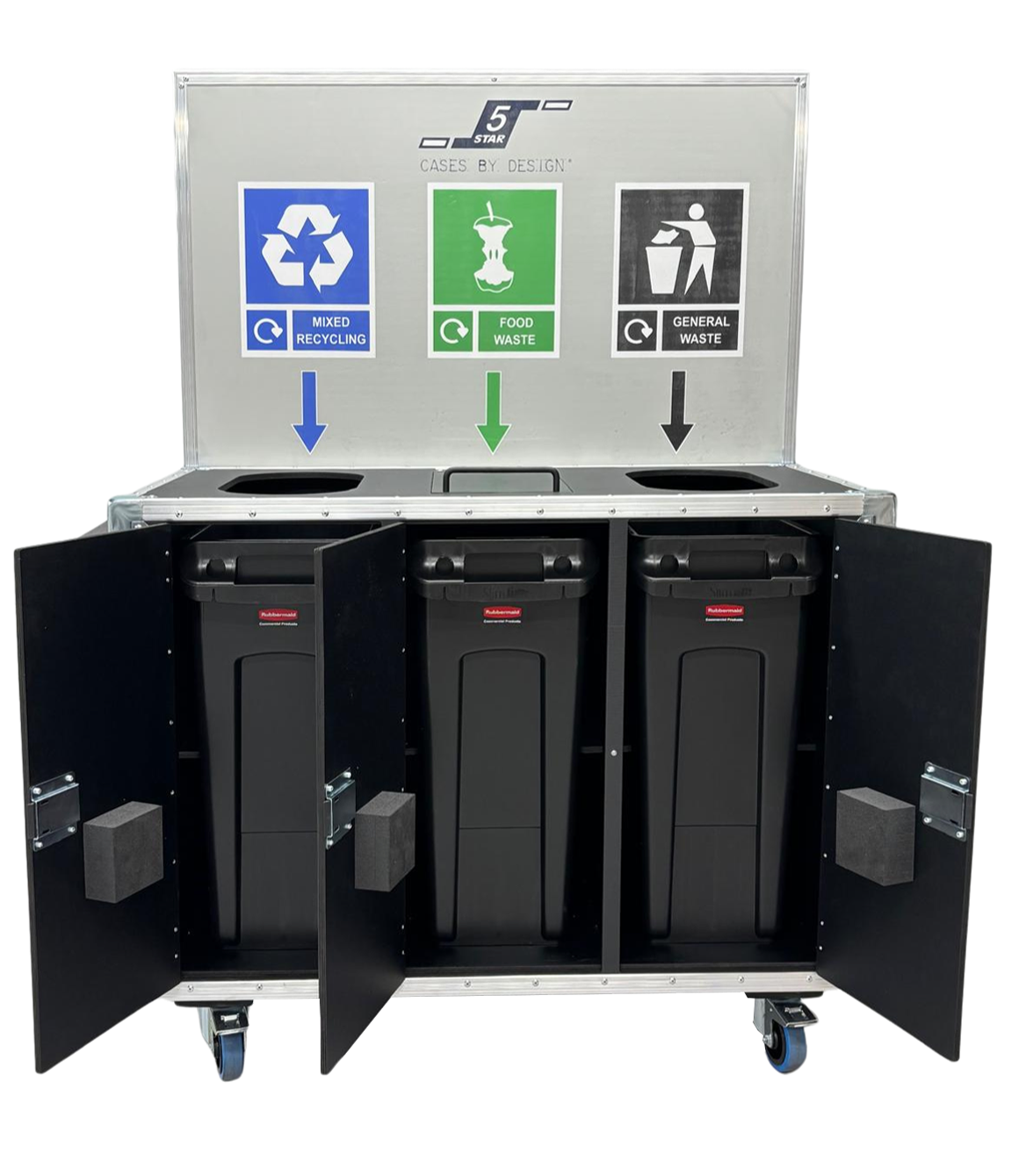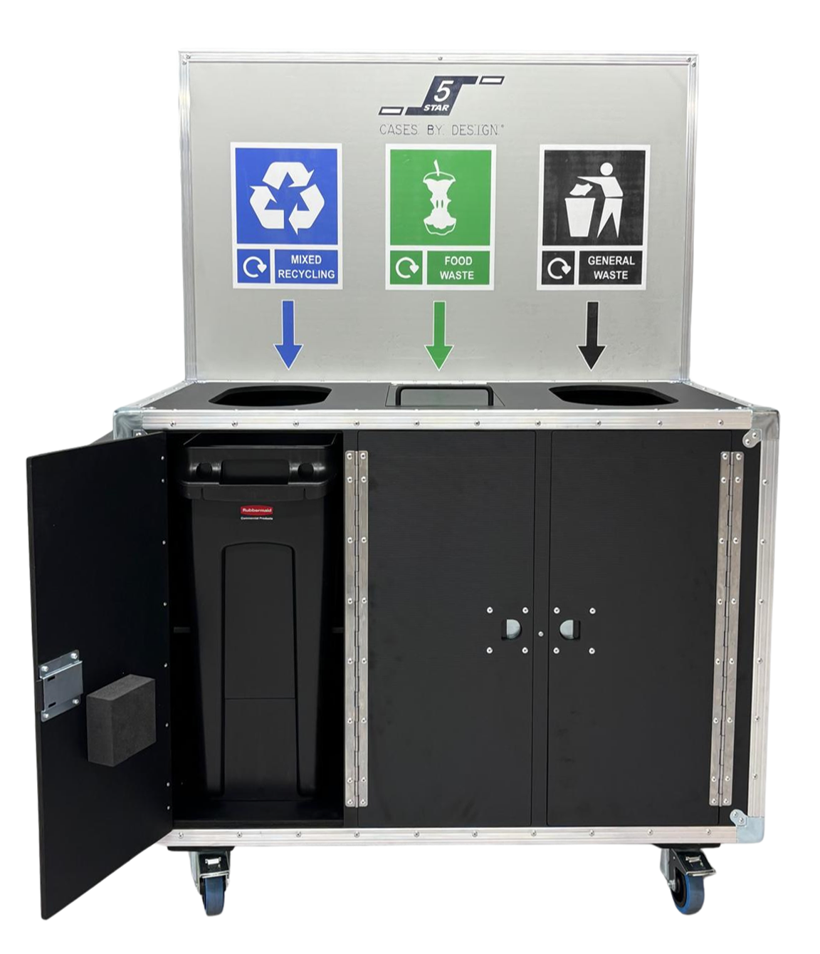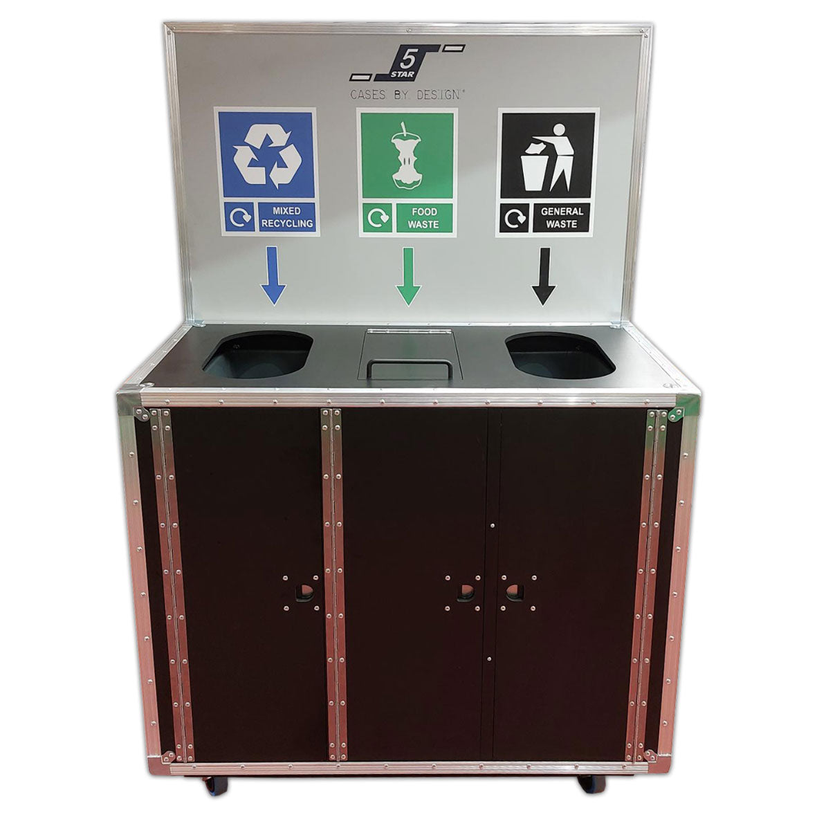 A customisable recycling station flight case with three sections for different types of waste; general waste, food waste and recycling. The area where the bins sit can easily be accessed via doors to the front of the station, and the station can be purchased with or without the three removable plastic bins. A flap over the food waste station helps to prevent pests from entering the waste.